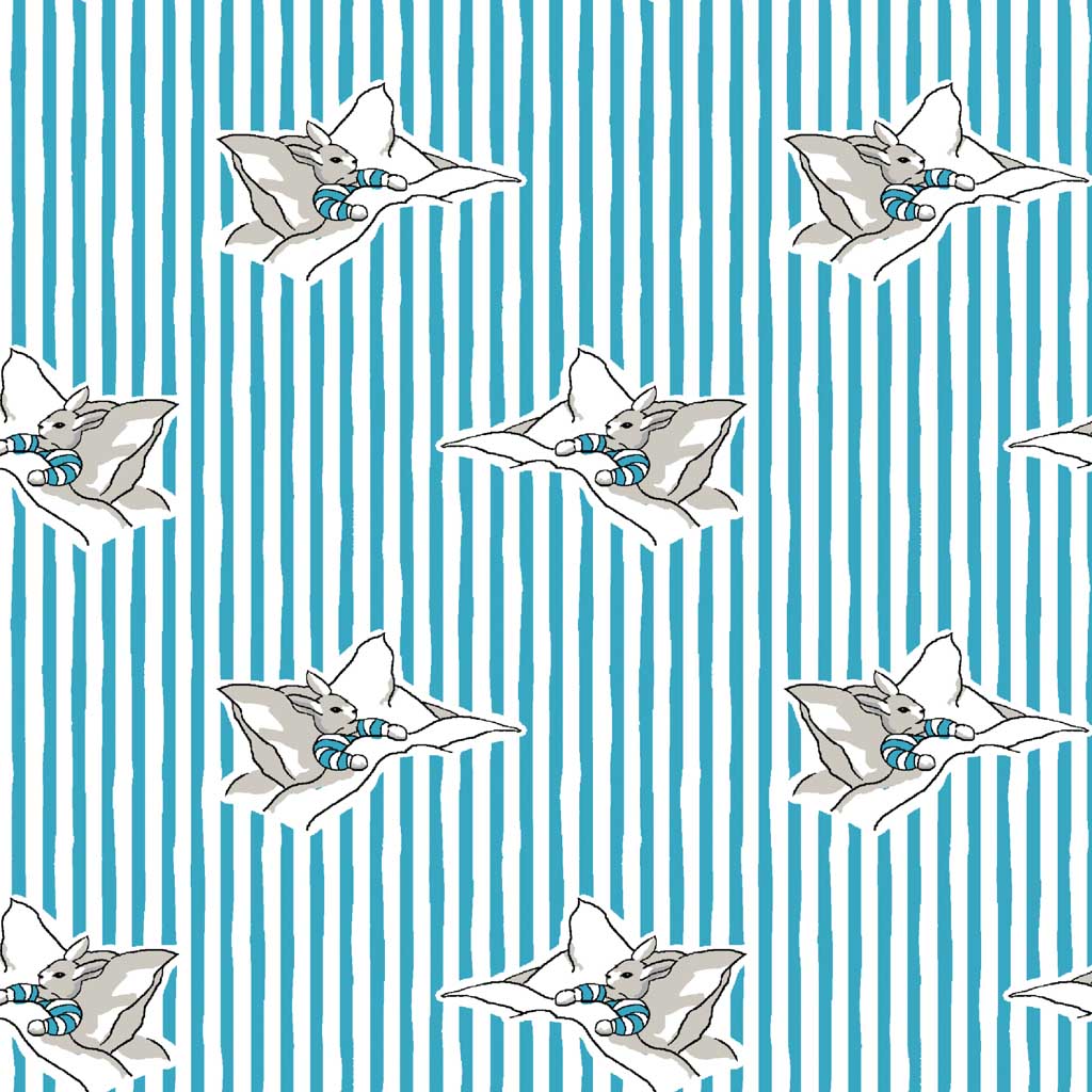 pattern of rabbits nestled in beds set against a background of blue and white vertical stripes