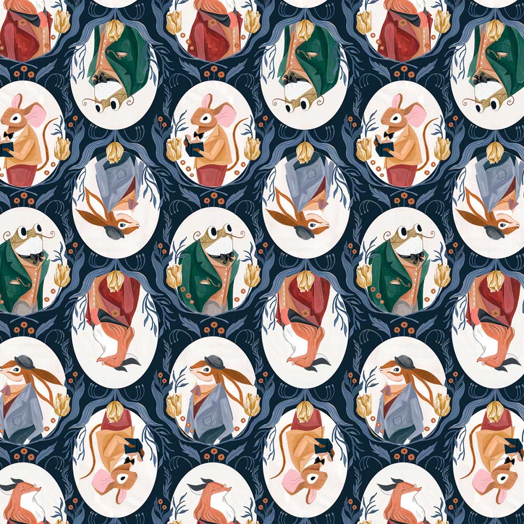 blue background with toile circles containing well-dressed mice, rabbits, frogs, and foxes