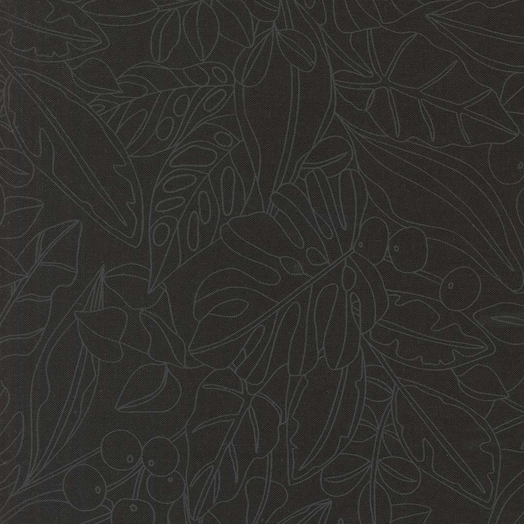 patterned fabric with leaves and berries on a black background