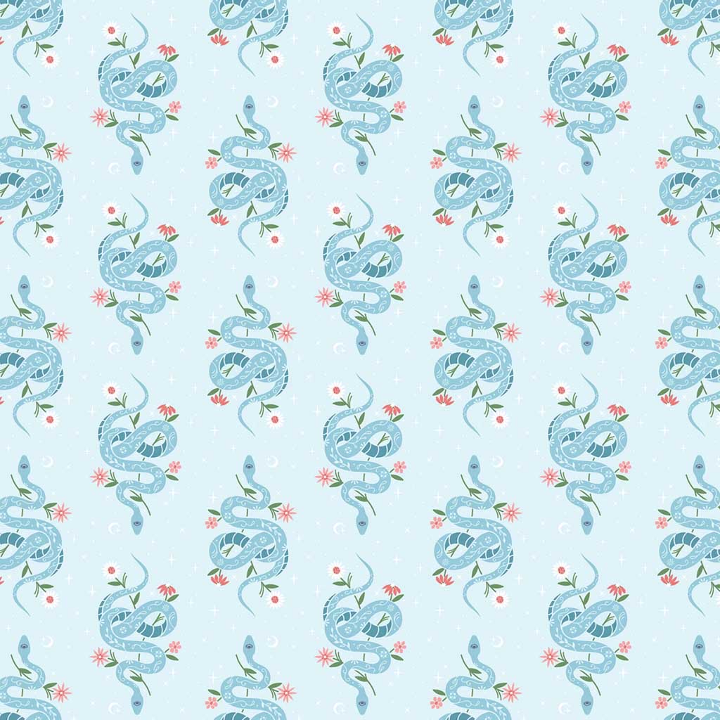 pattern of blue snakes and flowers on a light blue background