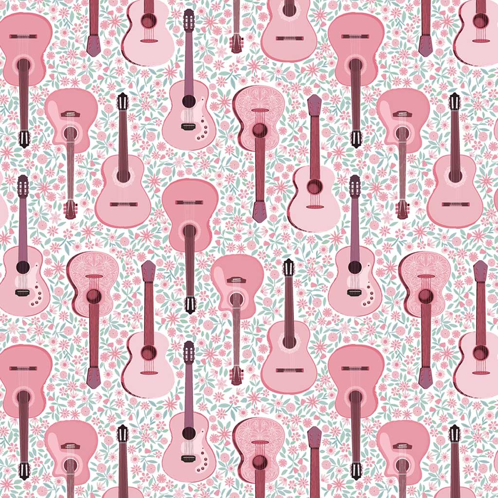 pattern of pink guitars on a floral background