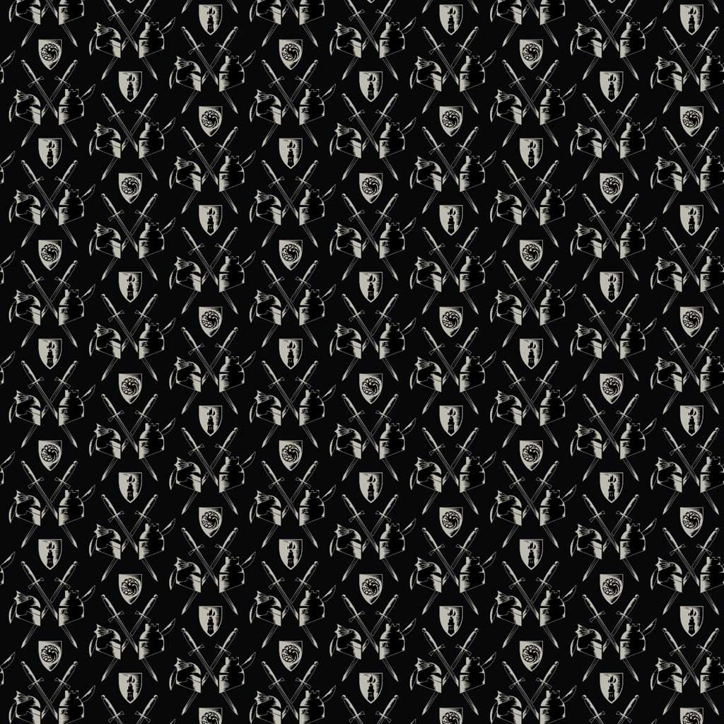 pattern of swords, armor, and shields on a black background